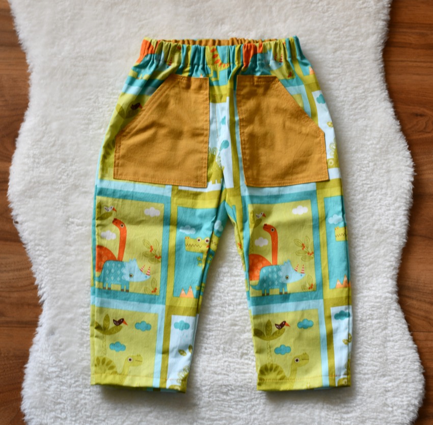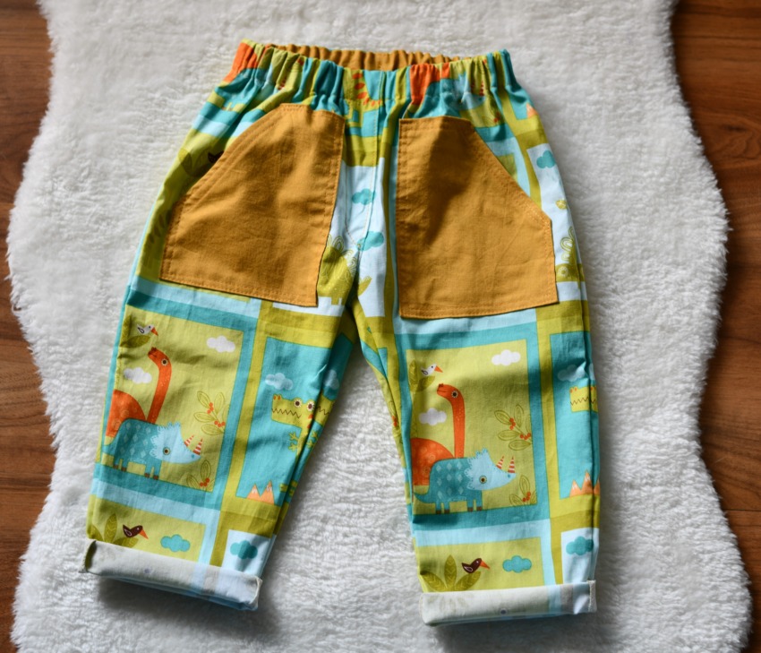 - Scrap-friendly: If you run low on your main fabric (like I did with my dinosaur print!), you can use a coordinating solid for the pockets and waistband facing.
