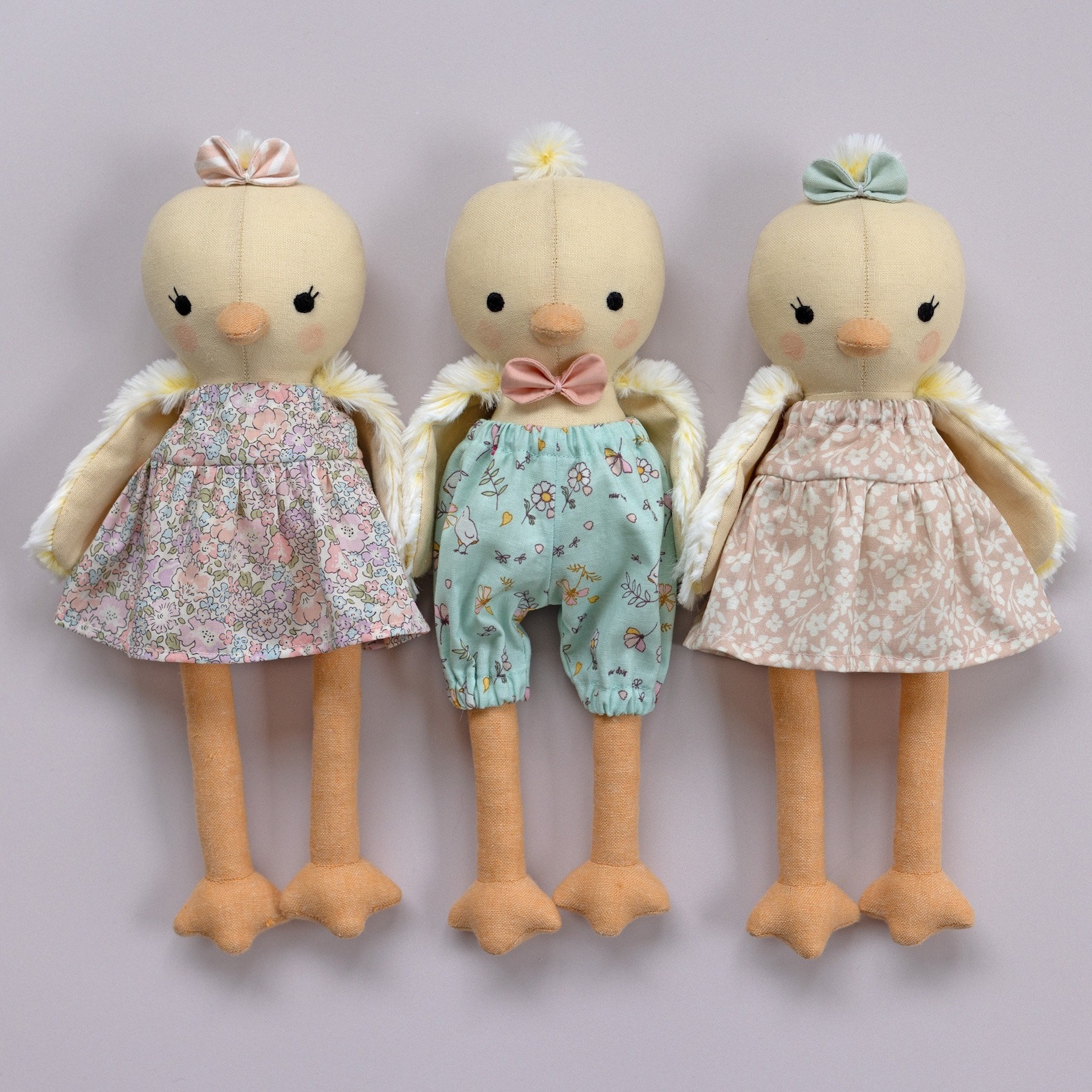 This pattern is very versatile. You can make a chick, a chicken, or even a mallard duck. It includes patterns for little clothes like dresses and shorts. It is a mini-size doll at about 11 inches tall.